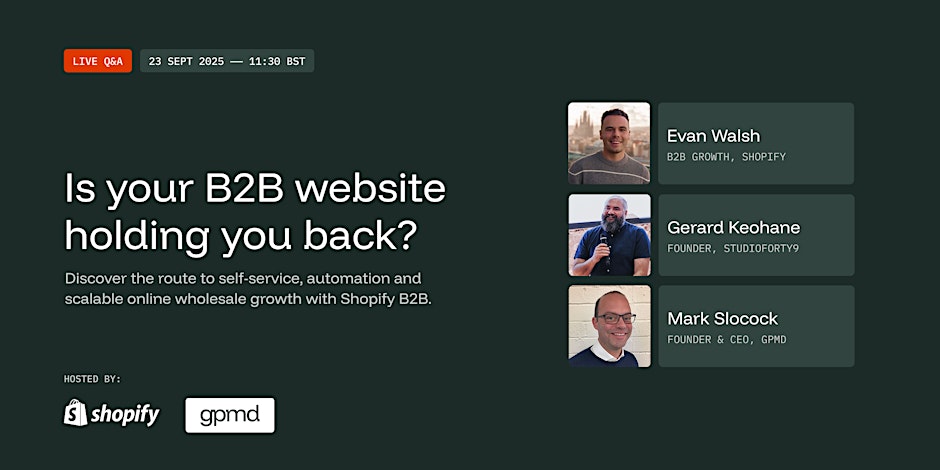Is your B2B website holding you back? Join StudioForty9, GPMD, and Shopify for a webinar to discover how Shopify B2B can boost sales and streamline orders.