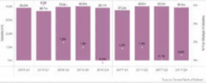 Cheque usage continued to fall in H2 2017, dropping by 9.7% in volume year-on-year and by 5.3% in value. This is despite the government’s decision to refund Irish Water charges in late 2017 by cheque. Credit transfers and direct debits saw modest growth year-on-year, with credit transfers (including online and mobile banking transfers) growing by 4.8% year-on-year and direct debit by 2.4%. Of all domestic credit transfers in the second half of 2017, only 1.4% of them were paper-based. This signifies the continued move to paperless transactions that was noted in the first monitor.